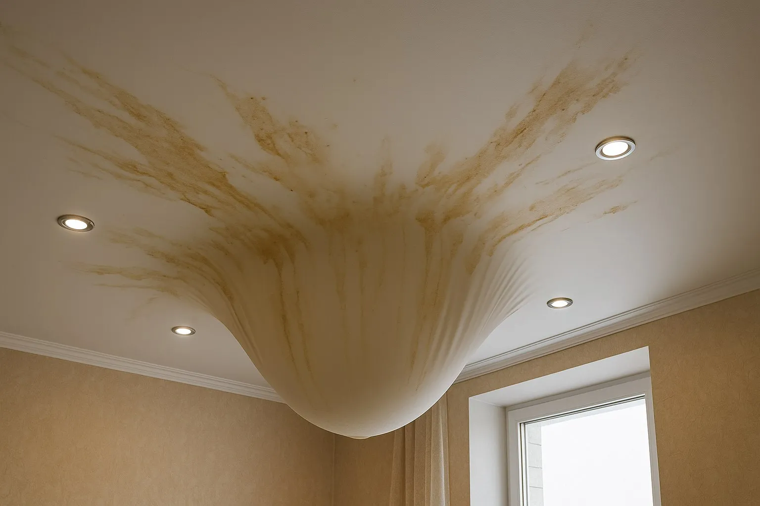 Минимизируем вред имуществу и, по возможности, аккуратно сольем воду с натяжного потолка.