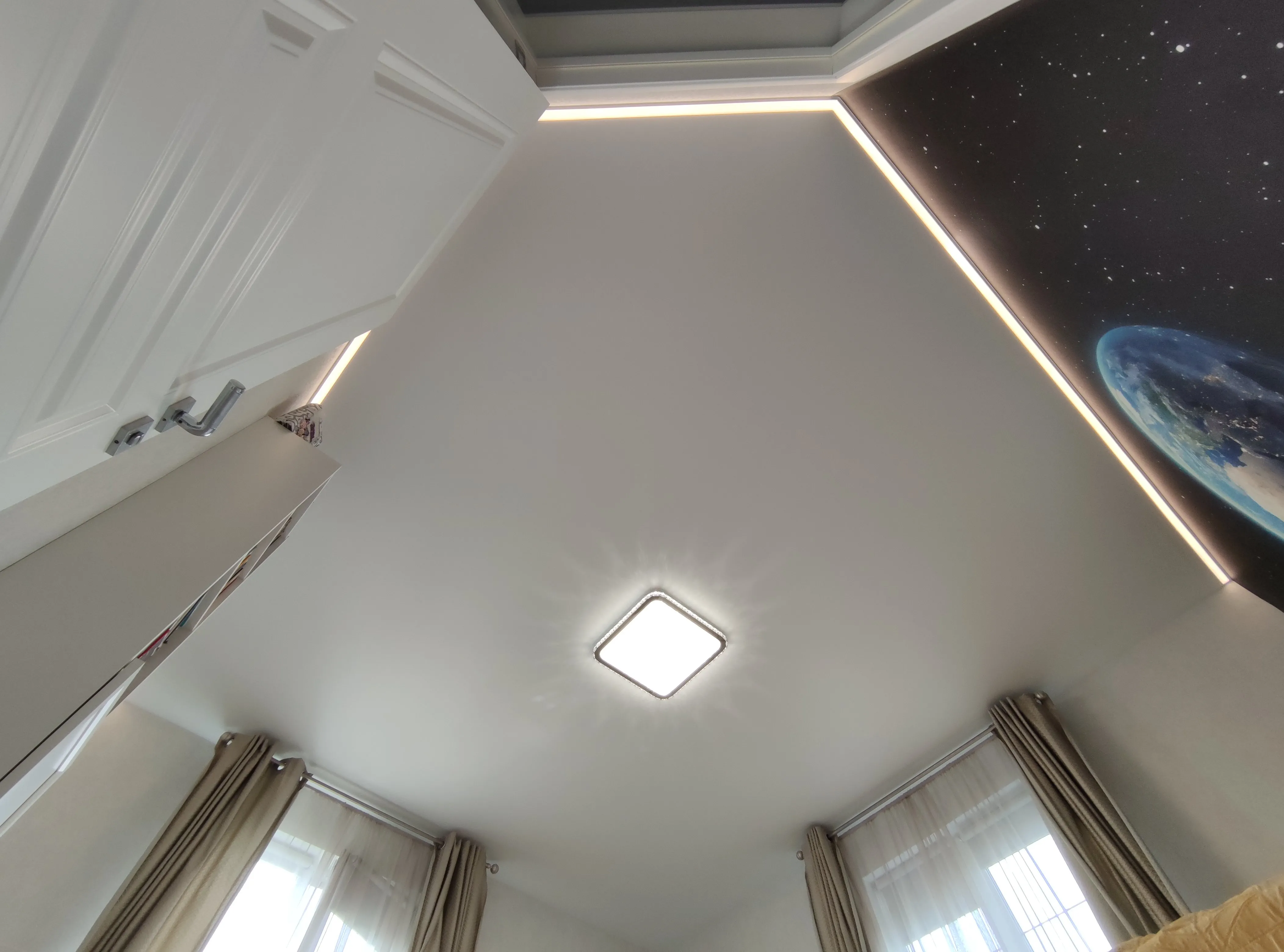 Натяжной потолок с контурной подсветкой — оригинальное решение для спален и гостиных. Они создают красивый световой эффект и уютную, спокойную атмосферу. Заказать потолочную систему с подсветкой по периметру комнаты в Дзержинском по доступной цене можно в нашей компании «Седьмое небо».