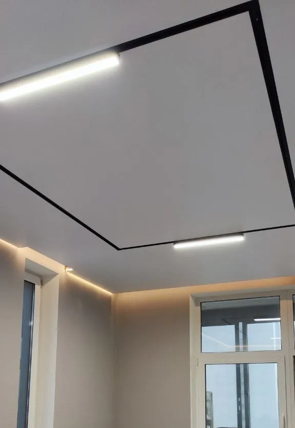 Сделали контурный натяжной потолок - выглядит круто. Рассматривали и теневой натяжной потолок, но в итоге выбрали контурном. Качество работы шикарное, потолок эффектный, интерьер сразу стал выглядеть дороже.